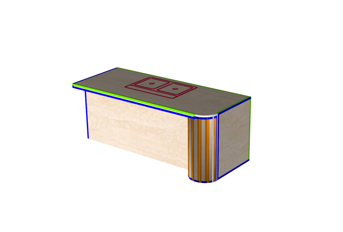 Accurately defining the rounded edge geometry so the system interprets the curves and laminate buildup in 3D, followed by refining the countertop’s underside return to align with the casework support radius.