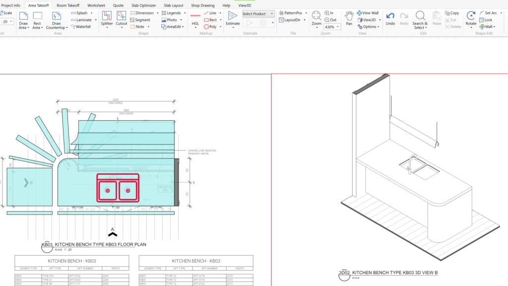 Takeoff overview in MeasureSquare Stone & Tile3D view in MeasureSquare Stone & TileShop Drawing in MeasureSquare Stone & TileProject Worksheet